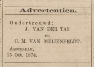Jan van der Tas, koopman, geboren Wateringen, oud 25 jaar, zoon van Leendert van der Tas, bakker te ‘s-Gravenhage en Johanna Beekenkamp, overleden, en Catharina Margaretha von Meijenfeldt, zonder beroep, oud 18 jaren, afkondiging 15 en 27 dezer, overgelegd geboorteakten verloofden en overlijdensakte, getuigen Pieter Kreber, oom van de bruid, opzichter, 46 jaar, Haarlem, (…) |