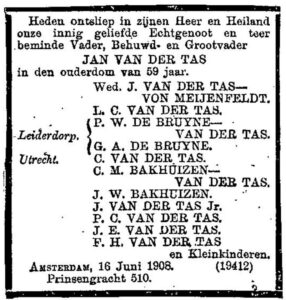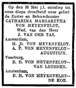 N.56. Catharina Margaretha (Cato) von Meijenfeldt, * Amsterdam 03-04-1856, ≈ CGK Nieuwe Kerk 06-10-1867, † Leiderdorp 28-05-1930 (74 jr), ≡ A’dam Te Vraag 31-05-1930, dochter van Carl von Meijenfeldt en Petronella Wilhelmina Diederich, ∞ Amsterdam 29-10-1874 Jan van der Tas, * Wateringen 11-06-1848, † Amsterdam 16-06-1908 (60 jr), ≡ Te Vraag 2-06-1908, kruidenier, zoon van broodbakker Leendert van der Tas (1824-1885) en Johanna Beekenkamp (1822-1863 ∞1 Nicolaas van der Vlugt), kinderen: 1. Leendert Carl van der Tas (1875-1919) ∞ Philippine Johanne van der Valk Bouman (1880-1920), zoontje Jan (1811) 2. Petronella Wilhelmina van der Tas (1877-1878) 3. Petronella Wilhelmina van der Tas (1878-1932) ∞ Gerritje Adriaan de Bruyne 4. Johanna Carllina van der Tas (1880-1881) 5. Carl van der Tas (1881-1965) ∞ Emma van de Grampel 6. Catharina Margaretha van der Tas (1883-1940) ∞ Johan Wilhelm Bakhuizen 7. Johanna van der Tas (1885-1886) 8. Jan van der Tas (1887-) ∞1 Henriëtte Reijseger ∞2 Catharina Hendrikje Ringeling 9. Pieter van der Tas (1889-1890) 10. Pieter Cornelis van der Tas (1892-) ∞ Neeltje Christina Maas 11. Johanna Everdina van der Tas (1894-1967) ∞ Jan Hendrik Landwehr 12. Frederik Hendrik van der Tas (1896-) ∞ Splinter |