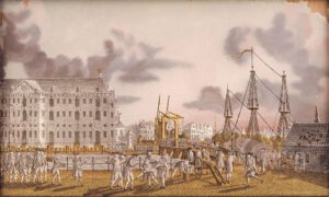 De Prinsgezinde scheepstimmerlieden hadden de brug toen opgehaald om zich te verweren tegen de Patriottische vrijkorpsen, die de brugtouwen een dag later kapten en op het eiland bloedig wraak namen. Pas het staande houden van prinses Wilhelmina bij Goejanverwellesluis een maand later was de werkelijke aanleiding tot de Pruisische inval en de vlucht van de Patriotten naar Frankrijk. Tijdens het wachten ziet Johan August het enorme wit bepleisterde Zeemagazijn liggen. Hij kan niet zien dat het twee jaar eerder helemaal was uitgebrand tot op de zwart geblakerde buitenmuren. De voorraden zeilen, vlaggen, scheepsuitrusting, water, voedsel en – belangrijker voor hem – kanonnen en ammunitie zijn aangevuld. Alleen het buskruit ligt nu veiligheidshalve elders. Sinds 1973 is hier het Nederlands Scheepvaartmuseum gevestigd.