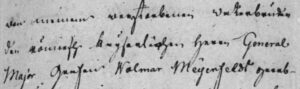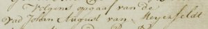 De naam van de stamvader is dezelfde als die van de Zweedse graven: Johan August von Meijenfeldt. Uiteraard verschilt de n in plaats van de r in het midden van de achternaam. De vraag is of dat een relevant verschil is. In de Zweedse en Duitse spelling staat soms een n, terwijl de Nederlandse naam wel eens met een r wordt geschreven. De twee letters wisselen doordat ze in handschriften niet altijd goed te onderscheiden zijn, zoals blijkt uit de volgende voorbeelden.